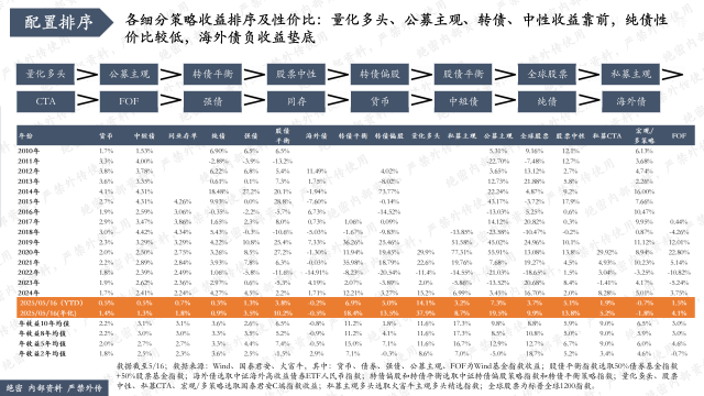 权益市场大涨影响相关产品收益显著提升,各策略除债外均跑赢货币基金收益,策略有效性回归,各债市年内波动较大,收益靠后。